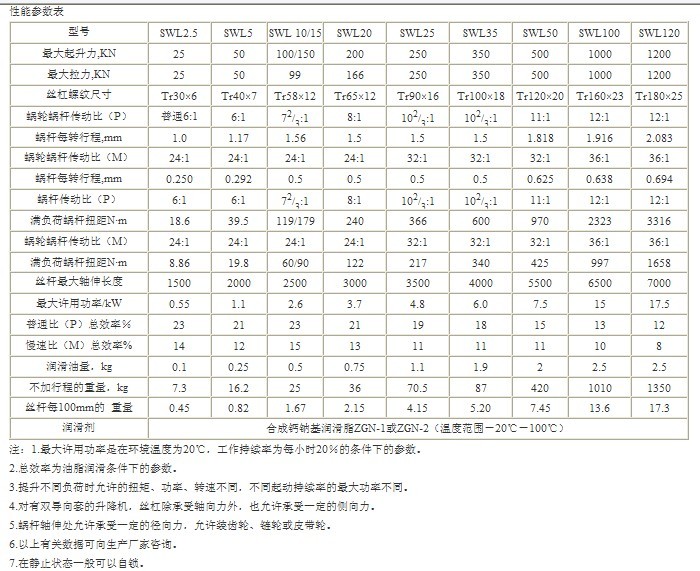 SWL系列蝸輪絲杠升降機(jī)是一種基礎(chǔ)起重部件,符合JB/T8809-1998(原JB/ZQ4391-86)標(biāo)準(zhǔn)。該產(chǎn)品可廣泛用于機(jī)械、冶金、建筑、化工、醫(yī)療、文化衛(wèi)生等各個(gè)行業(yè)。承載能力2.5—120T。具有結(jié)構(gòu)緊湊、體積小、重量輕、動力源廣泛、噪音小、安裝方便、使用靈活、功能多、配套形式多、可靠性高、使用壽命長等優(yōu)點(diǎn)。具有提升、降落、推進(jìn)、翻轉(zhuǎn)等功能,可以單臺或組合使用。能按一定程序準(zhǔn)確地控制調(diào)整提升或推進(jìn)的高度,可以用電動機(jī)或其它動力直接帶動,也可以手動。最高輸入轉(zhuǎn)速1500r/min,最大提升速度2.7m/min。有不同的結(jié)構(gòu)型式和裝配方式,提升高度按用戶的要求制造。該裝置可以自鎖。
